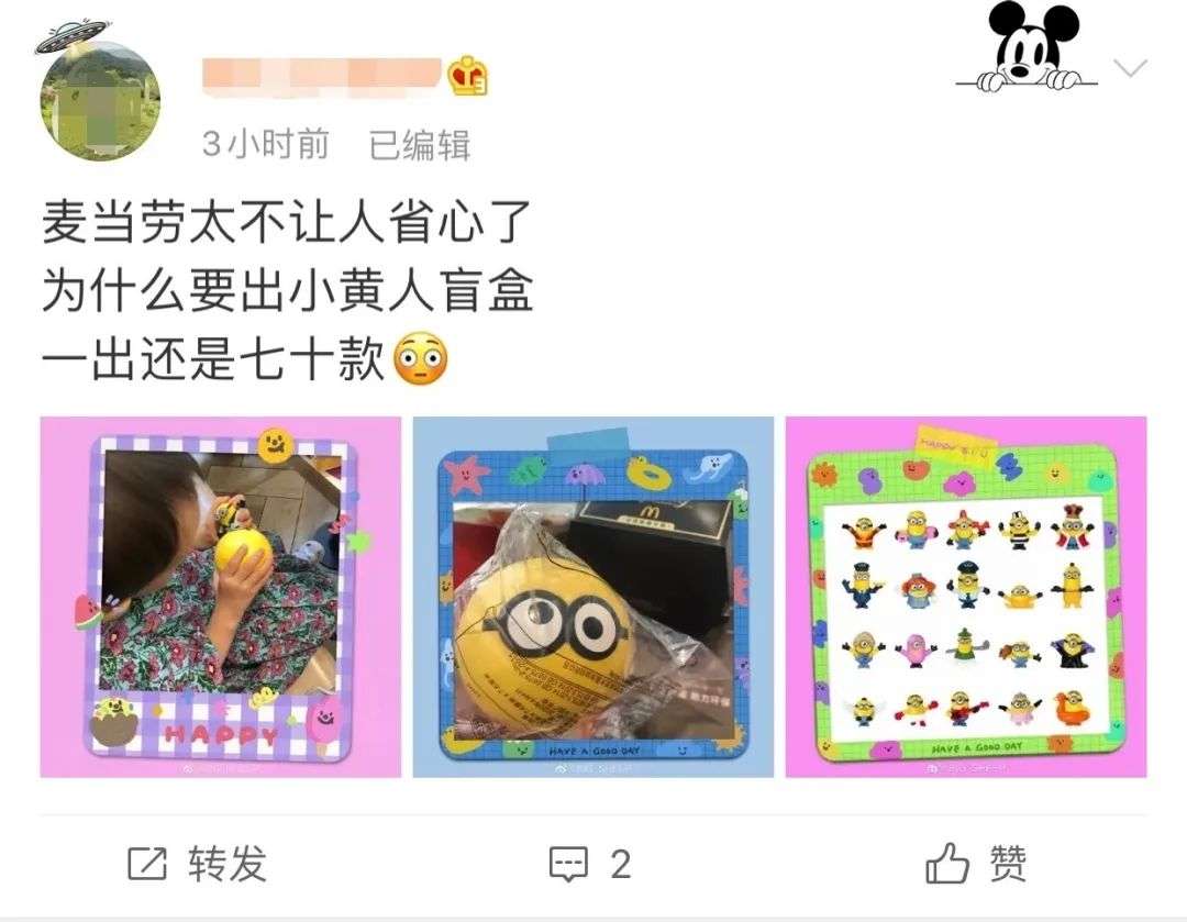 越来越多的网友也开始在微博晒出自己的小黄人盲盒。