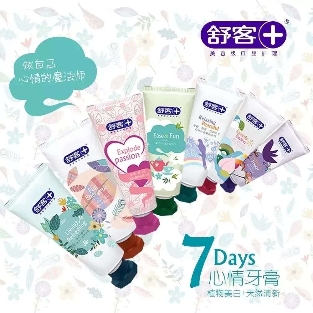 除了收集癖之外,品牌还可以通过不同产品体验的设置,给予用户“盲盒抽奖”的感觉。牙膏品牌舒客也曾推出一款“七天牙膏”,通过不同的包装设计、产品设计来给用户不同的心情体验,主打一周七天每天有不同心情。由于牙膏的口感口味在使用前无法预期,从而造成一种类似盲盒的心理体验。