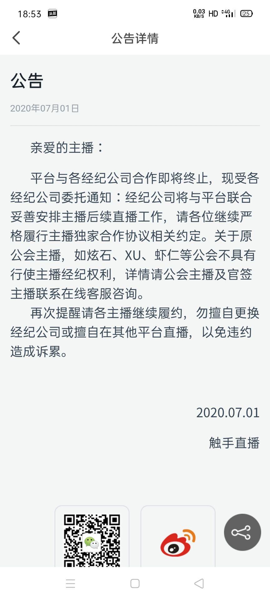 7月1日,触手公告,平台与各经纪公司合作即将终止,经纪公司将与平台联合妥善安排主播后续直播工作,请严格履行主播独家合作协议相关约定,勿擅自更换经纪公司或在其他平台直播,以免违约造成诉累。