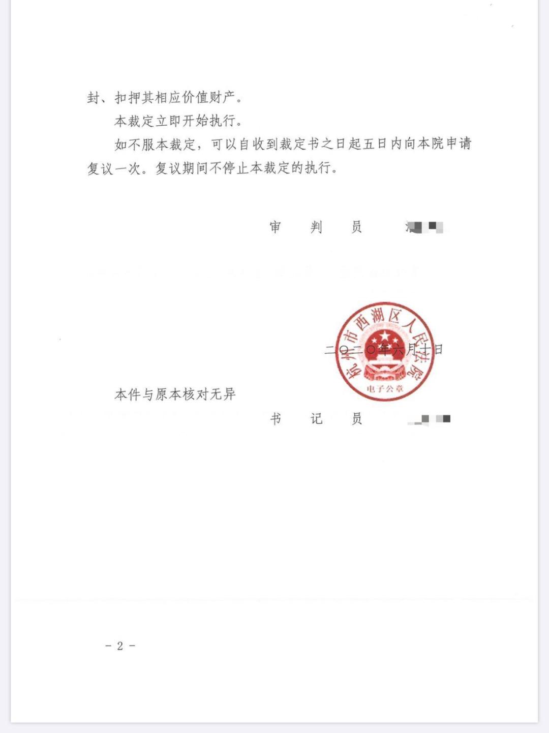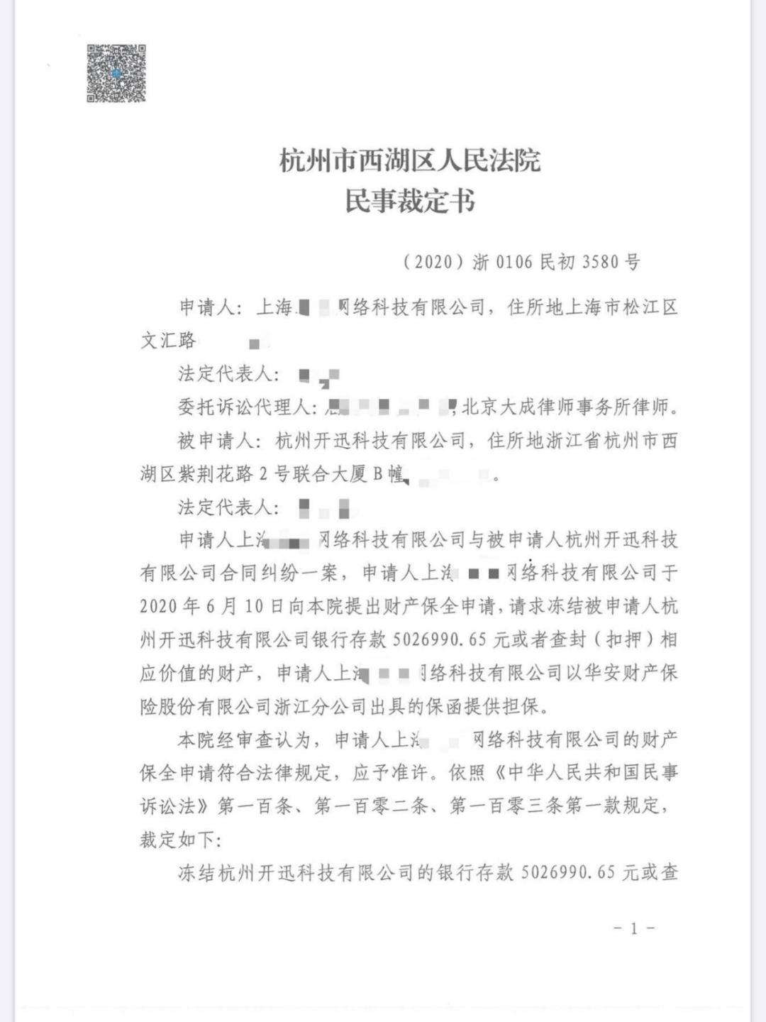 6月15日,杭州市西湖区人民法院依法冻结触手直播(杭州开迅科技有限公司)银行财产或相应价值财产500余万元。