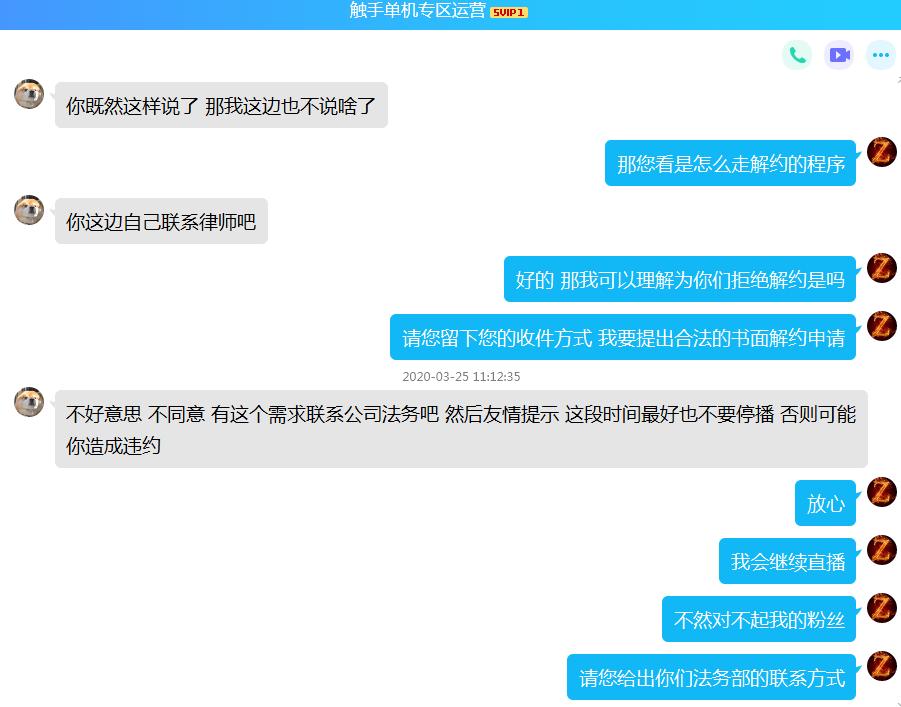 张小臣完成资料上传后于3月收到1月薪酬,但2、3月份薪酬再没了下文。加之触手于3月单方面提高了主播流水要求,张小臣申请解约,但遭遇运营拒绝。
