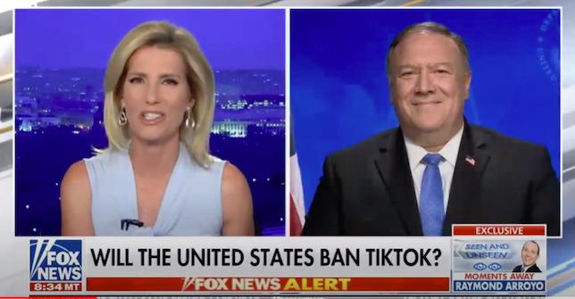 7 月 6 日,福克斯新闻(Fox News) 的主持人劳拉·英格拉汉姆(Laura Ingraham)在直播中向美国国务卿蓬佩奥(Mike Pompeo)提出一个问题:“印度封杀了 59 款中国 App,澳大利亚政府也在考虑封杀 TikTok,那么美国政府是否应考虑封禁中国社交媒体 App,尤其是 TikTok?“
