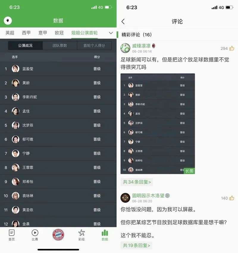最让足球迷用户恼火的是,在综艺《乘风破浪的姐姐》播出后, “姐姐公演首轮”的排名情况竟然挤进了数据页面内,与五大联赛、欧冠等赛事数据并列。懂球帝专门开设了“乘风破浪的姐姐“话题专区,更新有关节目和艺人的资讯,甚至30位参加节目的艺人,还在APP内拥有了个人标签——原本只属于球队、球员和教练的待遇。