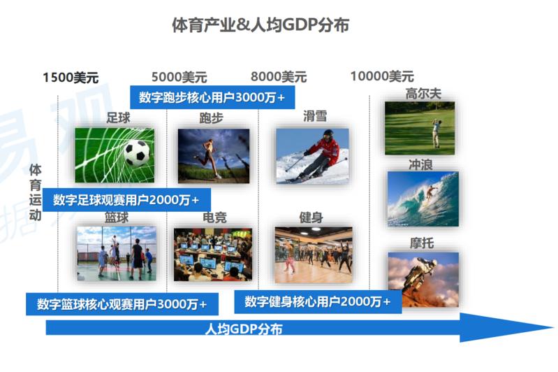 然而体育流量到底值不值钱?过去几年,这是整个行业都在持续探索并且缺乏重大突破的问题,尤其在足球这样的传统领域。根据易观公布数据,2019年足球用户的人均GDP仅为1500美元,相比而言,电竞用户的人均GDP超过5000美元,而健身用户的人均GDP更是高达8000美元,消费能力的差距显而易见。
