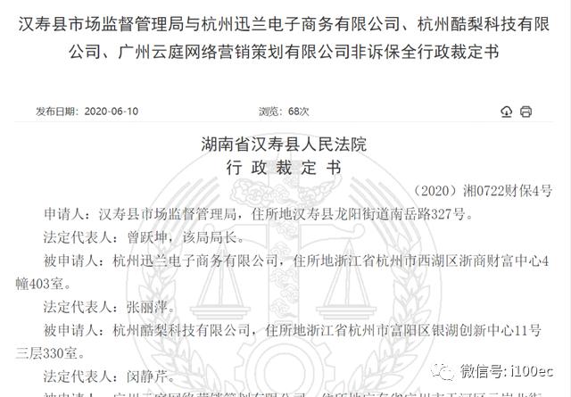6月10日,湖南省汉寿县人民法院对外披露了一起非诉保全行政裁定书,该裁定书显示:杭州迅兰电子商务有限公司、杭州酷梨科技有限公司、广州云庭网络营销策划有限公司因涉嫌传销,被冻结数千万元资金。