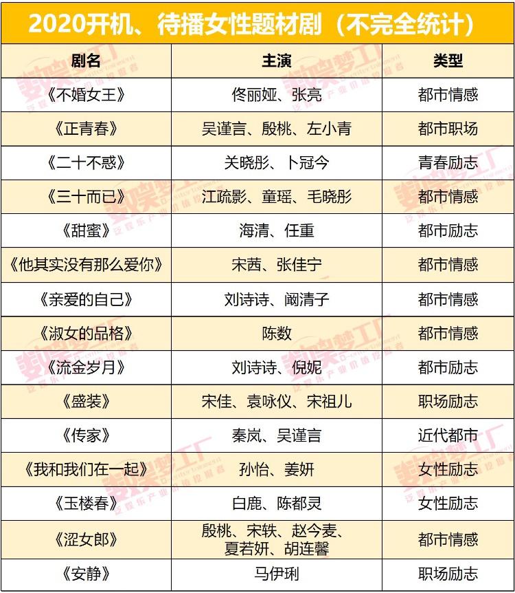 女性题材无疑已经成为国产剧一个新的热门类型。根据数娱梦工厂的不完全统计,2020年下半年开机和待播的女性题材剧已经多达10几部。