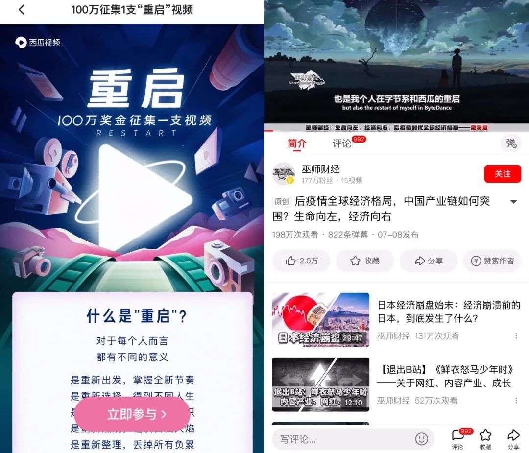 而另一边,7月8日,财经大V“巫师财经”则在西瓜视频上传了他的第一支独家视频首秀《重启:生命向左,经济向右》,评论区较为热闹,截至目前,巫师财经在西瓜视频上的粉丝为169万,一年内涨粉速度近百万,不可谓不快。