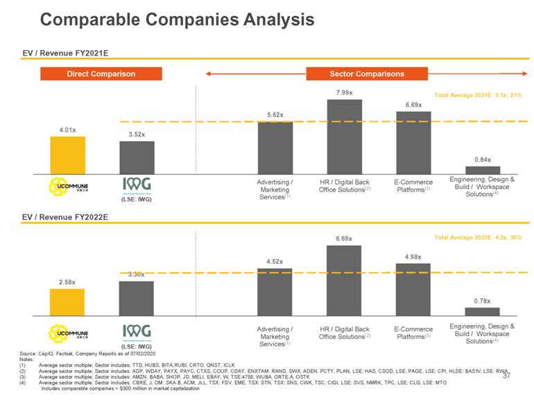 而根据Orisun与优客工场的协议,合并完成后新公司的价值将为7.69亿美元。而这一估值的来源则是优客工场采取EV/revenue的模型完成估值,即按2021年预计净收入的4.01倍计为7.69亿美元。