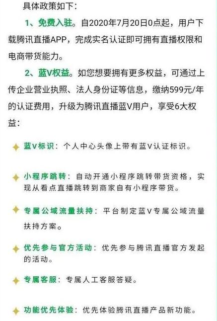 上周,腾讯直播团队发布“致腾讯直播商家及内容创作者的一封信”,宣布腾讯直播将于2020年7月20日起开启免费入驻通道。同时,腾讯直播还推出了6大“蓝V权益”:包括自动开通小程序跳转带货资格,实现从看点直播跳转到商家自有小程序带货,并享受专属公域流量扶持方案。