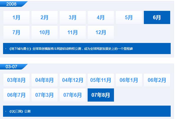 从2003年到2007年,腾讯游戏从代理到自研鲜有佳绩。在腾讯游戏官网的大事记里,这四年都直接被压缩了。直到2007年其皆连签下《穿越火线》和《地下城与勇士》,并在2008年推出,才算真正“上道”。
