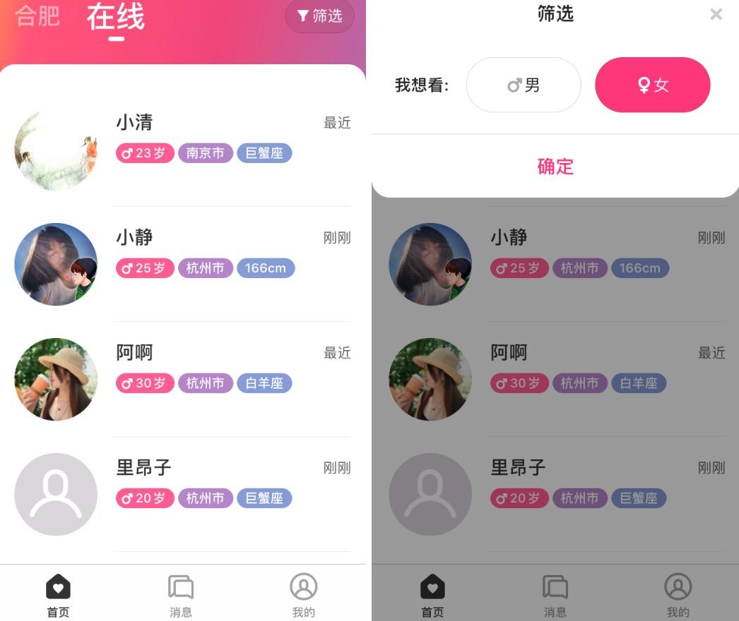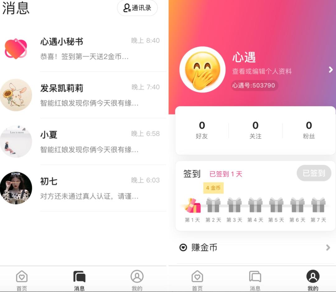 在功能设计上,心遇分为首页、消息和个人中心。