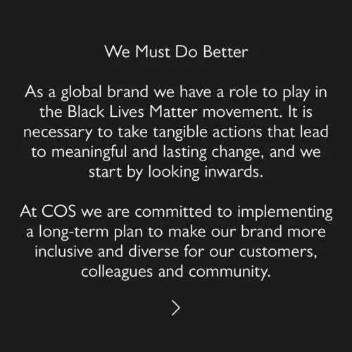 在6月份发布的Instagram帖子中,COS承认它收到的反馈意见表明,该品牌必须做得更好,并承诺将采取措施解决这些问题。其中,COS表示已经成立了一个工作组来推动内部和外部的行动,并将审查其招聘、发展和留用程序,以及与之合作的合作伙伴在这方面的举措。