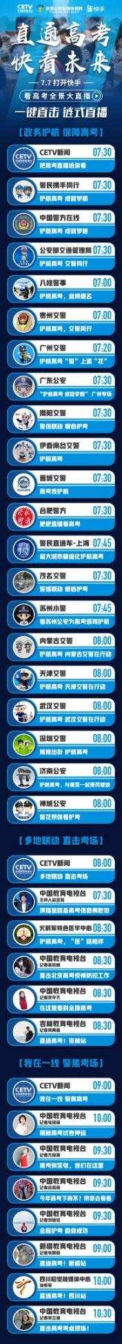 7月7日,中国教育电视台联合快手、全国公安新媒体矩阵于上午7:30重磅开启《直通高考 快看未来——高考全景大直播》大型多链路直播活动,活动集结了全国各地公安、交通、医疗、教育等多账号同步直击“高考首日”盛况。