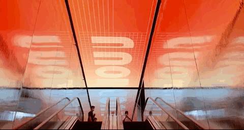 整体的设计也变得都更有科技感。墙壁上划满飞驰抽象的线条,横廊四处遍布滚动的数字,二三层连接的楼顶上,被一块巨大的幻彩电子屏填充,它大概也很快就会在朋友圈刷屏了。