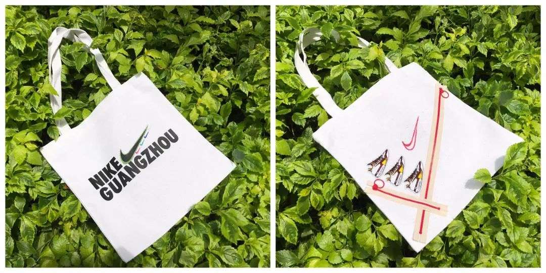 我在现场体验了一下广州定制的耐克环保包设计。走到一楼的会员活动专区时,桌子上已经摆满了风格各异的耐克 Logo 标、五彩斑斓的布料,还有各种纽扣、贴纸、画板、印章,人们可以喷绘、浸染、涂鸦,自由挥洒那无处安放的艺术天赋。
