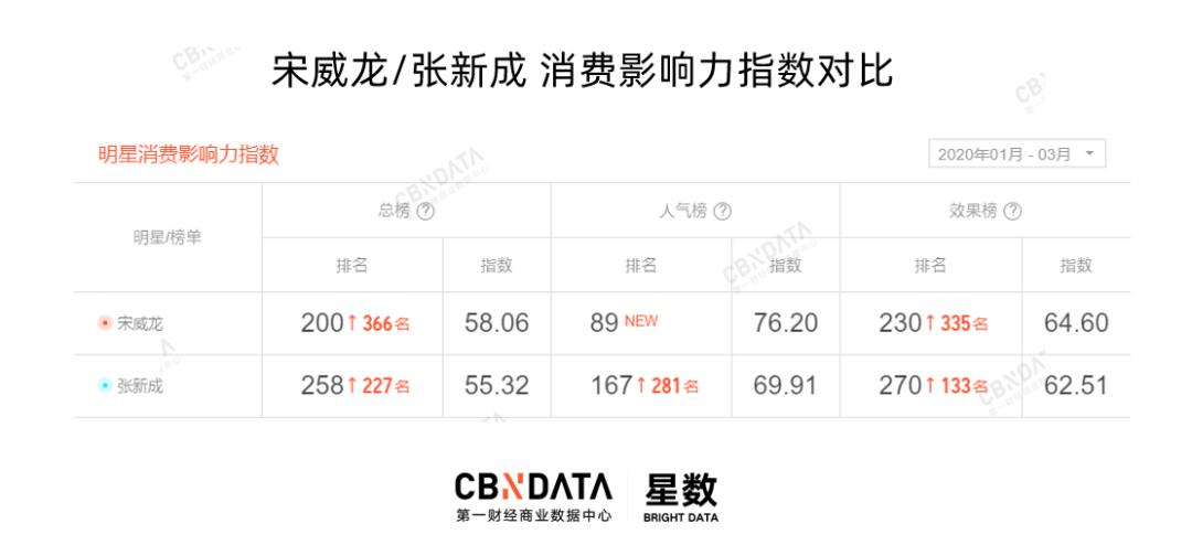 仅一季度,两人在星数明星消费影响力的排名都有飞跃式的进步,平均上升200名以上。