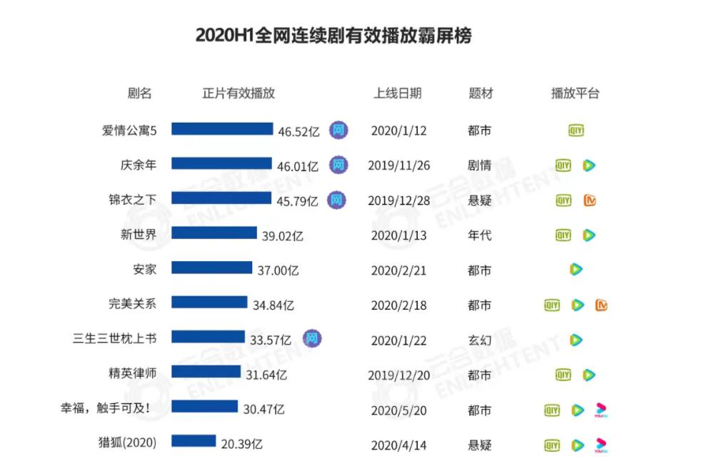 网络剧市场方面,也出现了不少惊喜。《爱情公寓5》以46.5亿有效播放领跑2020上半年剧集市场,《庆余年》《锦衣之下》《三生三世枕上书》在第一季度网播量方面表现亮眼。