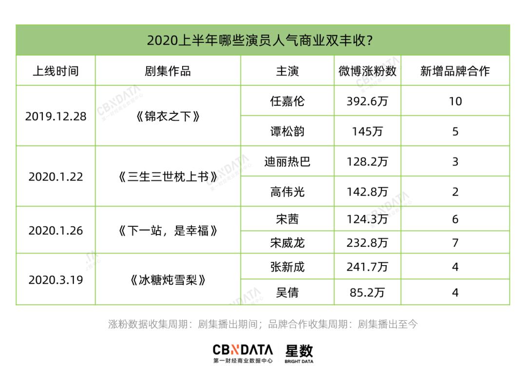 C站梳理了获得较多红利的演员们,大多数人以往就已经活跃在大众视野,年轻男演员的成绩最为突出。其中,《锦衣之下》的主演任嘉伦成为上半年获得最多品牌合作和涨粉量的明星。