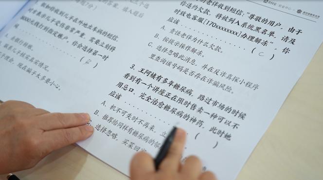 “此前社区里就有老人遭遇假冒警察,也有在网友诱导下点击不明链接被骗”,组织考试的社区党委副书记安宁敏称。“无意中在网上看到这套防骗考试题,觉得非常有意思,就让同事们把卷子打印出来,组织社区的老人们来做一做。”
