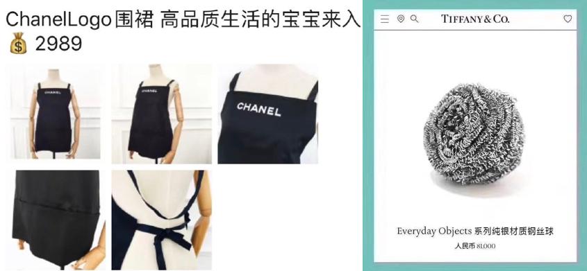 诸如印有香奈儿logo,售价将近3000元的普通围裙;摆摊、乞讨必备的罗意威三件套,只需24万即可拥有;还有口红售价100美金,却推出1900美元口红包的爱马仕;还有只需八万即可带回家的蒂凡尼纯银钢丝球,刷锅好帮手……