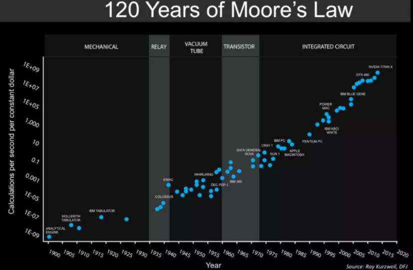 也就在1965年,英特尔创始人,时任仙童半导体实验室主任的戈登·摩尔通过观察发现每代芯片几乎都是前一代芯片容量的两倍,以此提出了推动半导体技术持续升级的“摩尔定律”。当时的版本是,集成电路芯片上可容纳的元器件数目,在价格不变的基础上每年翻一番。1975年,他又改为每两年翻一番。