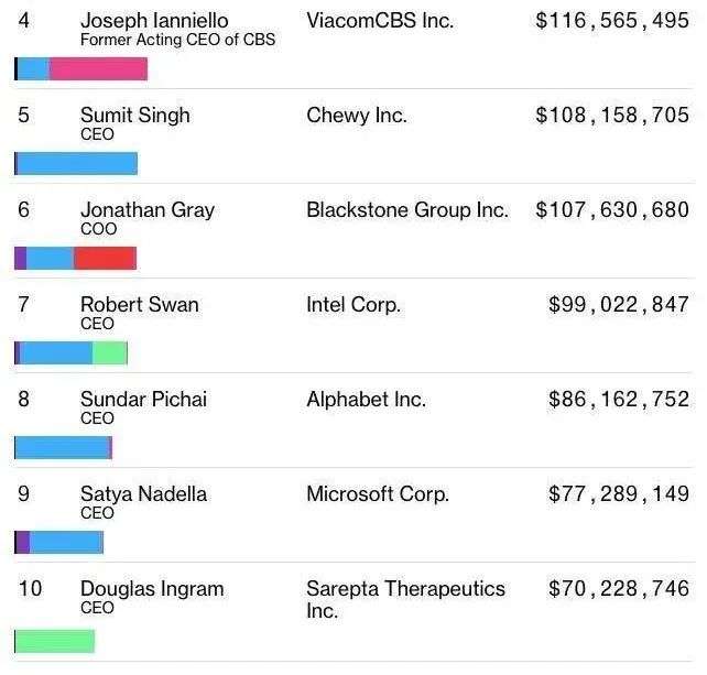 薪酬都超过1亿美元的高管还有,Charger Communications 的CEO Tom Rutledge、CBS前代理CEO Joseph Ianniello、Chwey CEO Sumit Singh和 Blackstone集团的首席运营官Jonathan Gray。