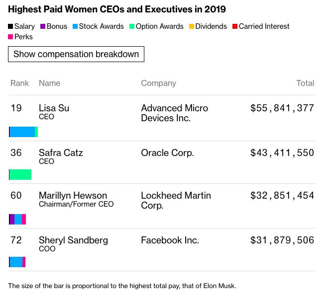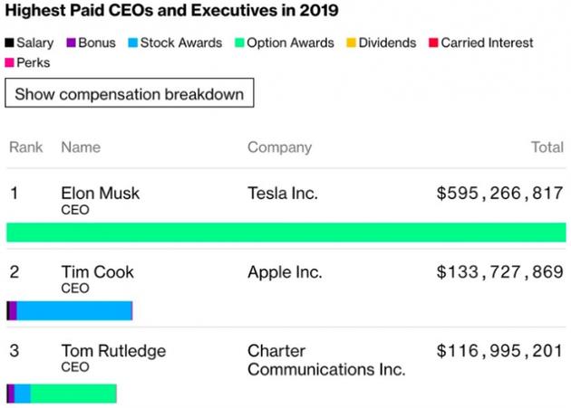 彭博2019年美国高管薪酬排名已公布!钢铁侠马斯克以近6亿美元薪酬跃居首位,苹果CEO库克排名第二。AMD女掌门苏姿丰成为薪酬最高的女性高管。