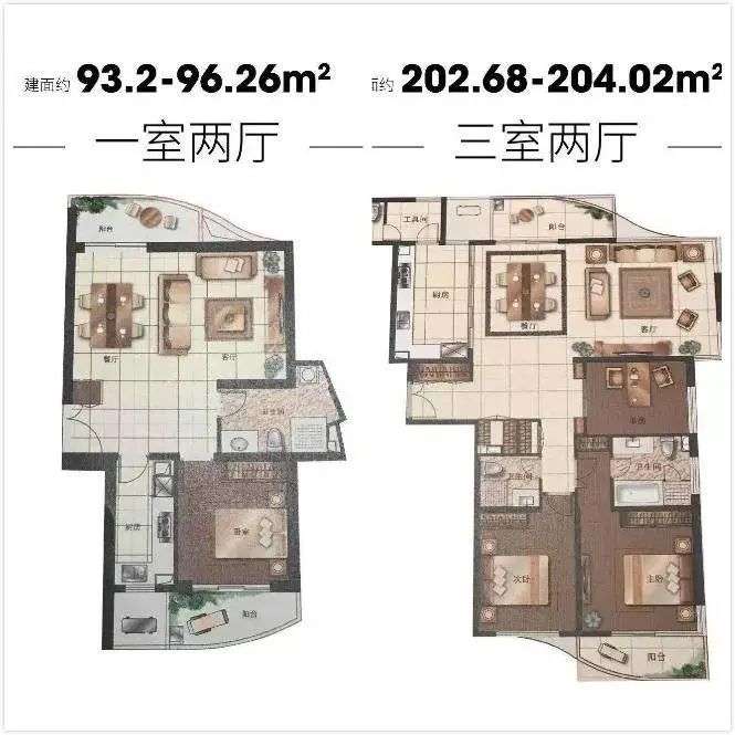 9万的均价,户型段有96平一房,120平两房,200平三房,差异化非常突出。