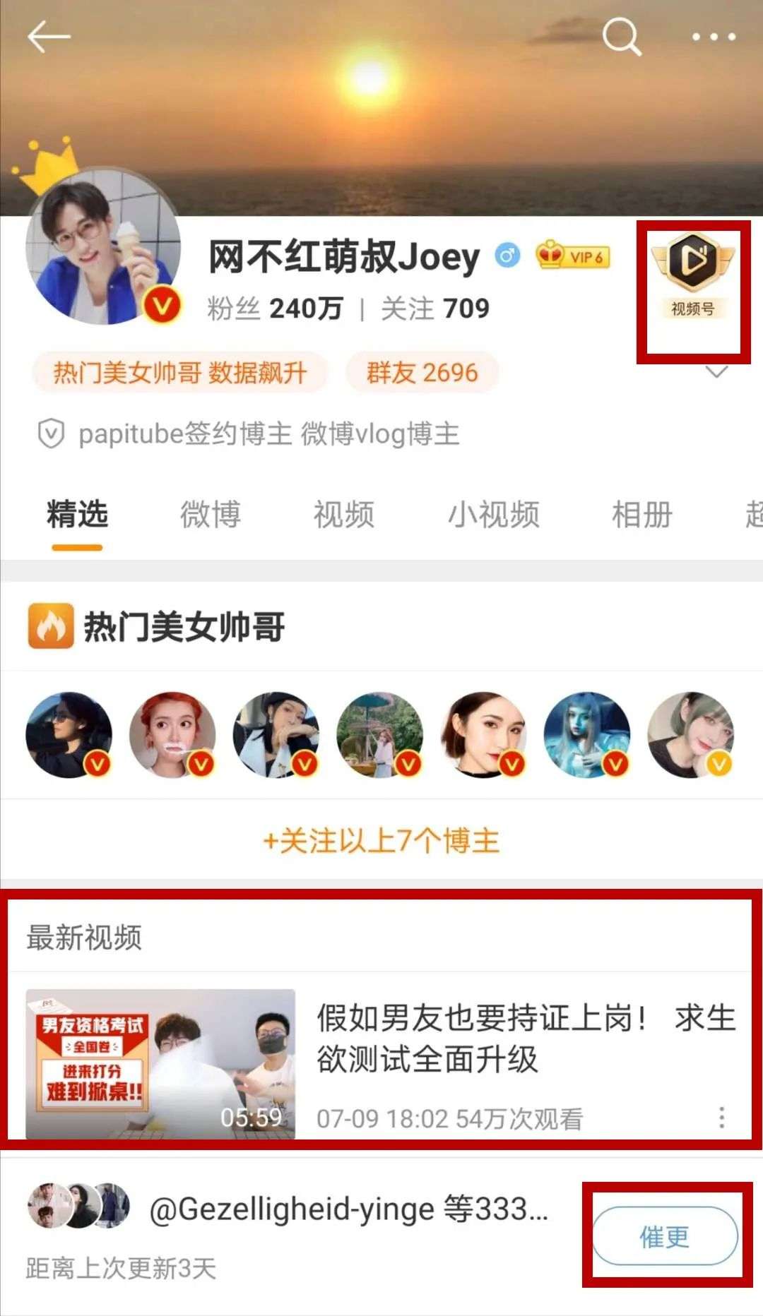 6月22日之后,网友可能会发现,自己关注的一些博主在主页上多了“视频号”的标识。除此之外,博主最新发布的视频也会直接显示在主页面上,下方则是粉丝的催更。据微博透露,催更人数可以看出博主粉丝的活跃程度。