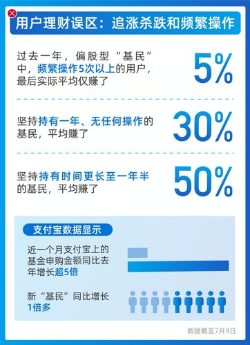 基金市场也类似。支付宝理财平台的数据显示,截至7月10日,购买了偏股型基金的“基民”中,频繁操作5次以上的人,一年下来平均仅赚了5%,而坚持持有一年、拿住不动的用户,平均赚了30%。如果坚持持有了一年半的用户,平均能赚50%。也就是说,基金越拿得住,持有时间越长,越可能多赚。