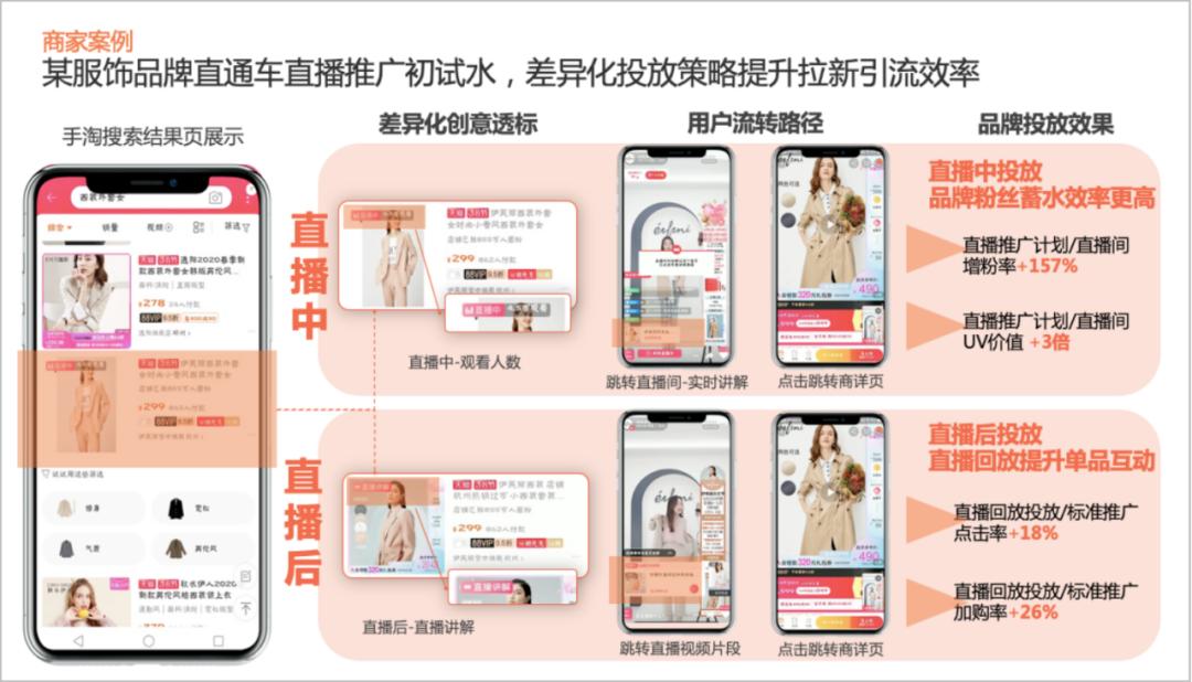 淘宝直播则不仅可以在直播中获得推广,还可以直播结束后,投放商品介绍的短视频(直播讲解)。