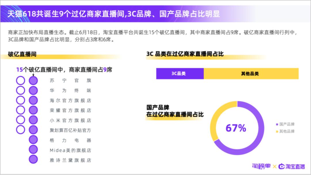 而在今年 618 期间,淘宝 15 个成交过亿的直播间中,商家直播间有 9 个,占了一大半。新开播的商家中,中小商家更是占到了 60%。