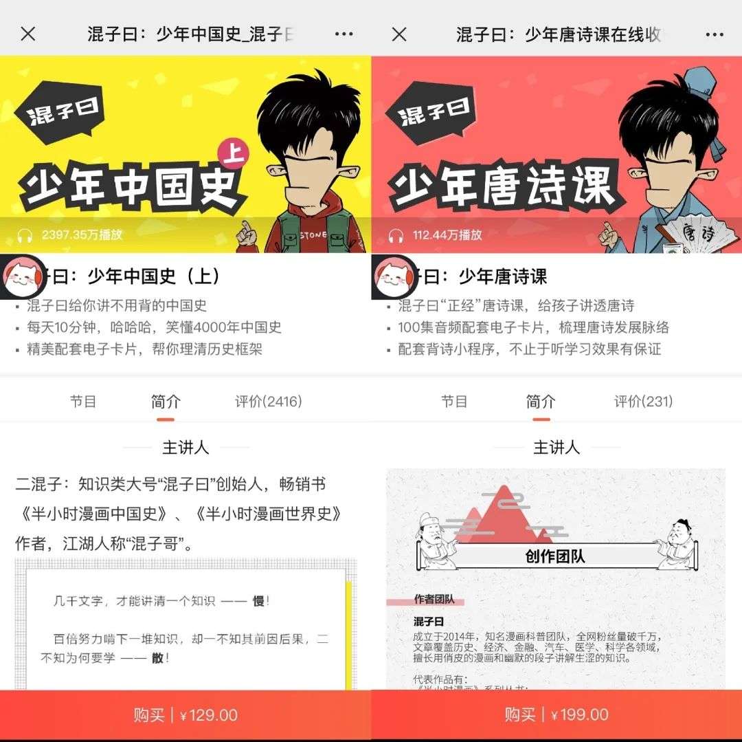 版权售卖:公众号「混子曰」的创作者原是一名普通的自媒体人,通过诙谐幽默的漫画讲述历史史实以及各种复的科技原理和热点事件解析,打造了“二混子”的专属IP内容,在公众号内更新的系列历史内容,编辑成系列套书《半小时漫画中国史》,陆续在各大读书网站实体书店商家,目前已经经历了三轮签售发行;