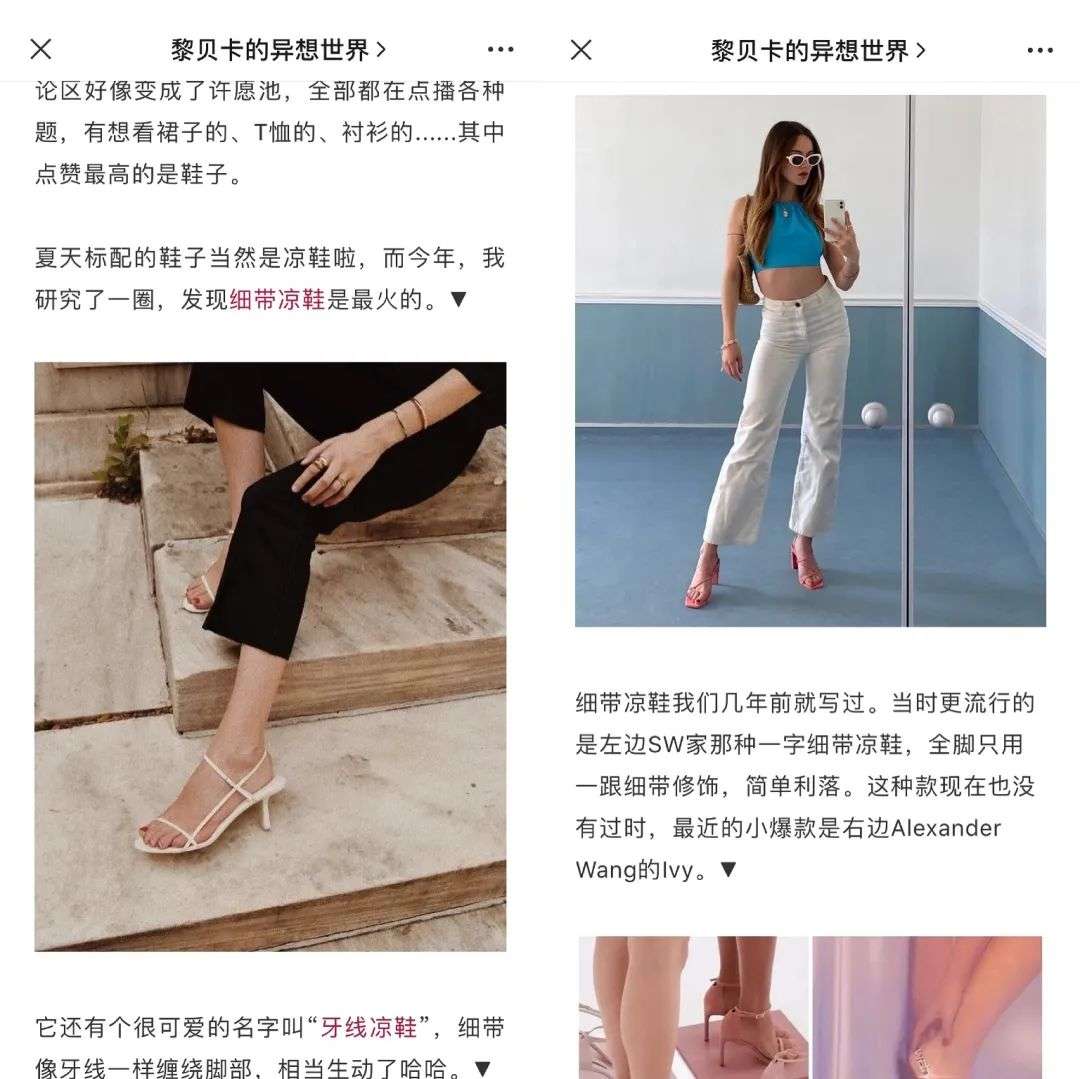 以公众号「黎贝卡的异想世界」为例,原本黎贝卡只是为粉丝些资讯穿搭技巧,但是纯分享的形式过于单一,慢慢的黎贝卡开始在每一个推荐的商品下面加上购买链接,没想到通过图文形式的商品介绍以及穿搭推荐,商品转化率十分可观。