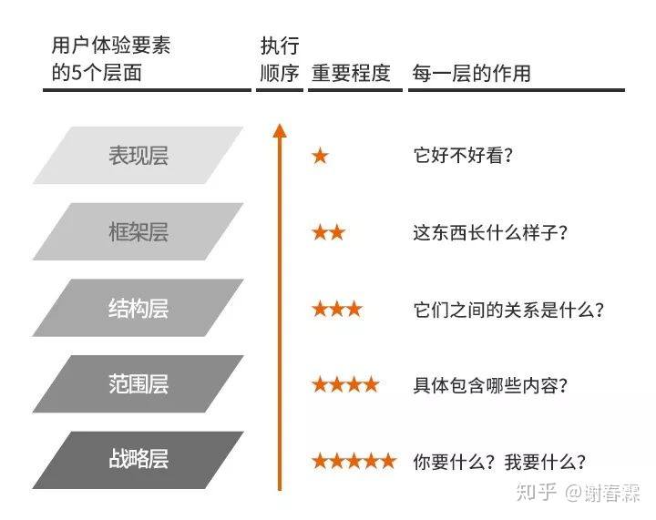 因此,重要性也是越早的阶段越重要,比如“战略层”的重要程度就是五颗星,它是这里最重要的任务,甚至也是你所有任务中最重要的任务,它决定你要建什么,为什么要建这个,一旦战略层错了,后面的努力都是浪费精力,这个也是我们第25课重点讲的内容,好的开始是成功的一半;而“表现层”的重要程度就要低很多,样子好不好看直观感受最强烈,但对最终的成败影响却是最小的。
