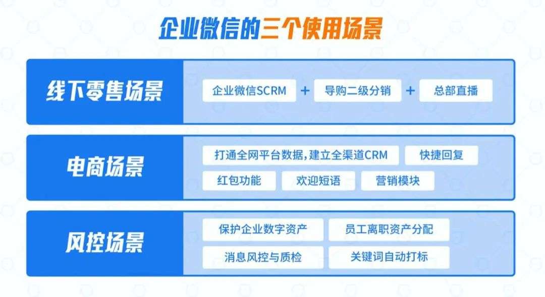 说完微信生态,我们再拆解一下企业微信在不同行业的解决方案和运营方式。我总结了三个板块,分别是:线下零售场景、电商场景和风控场景