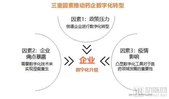 但是,近年来,随着各种因素的影响,医药企业已经认识到数字化转型迫在眉睫。结合我们在第二部分对政策、产业及疫情分析,政策压力、产业自我救赎及疫情影响这三个关键因素正在推动企业进行数字化转型。