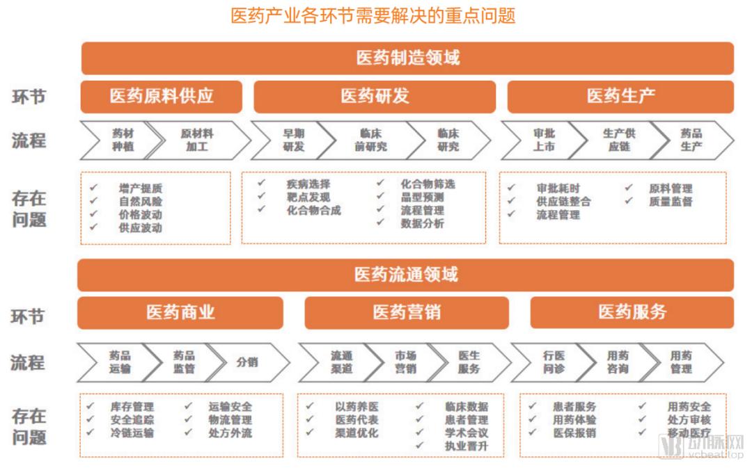 中国医药产业经过多年的发展及探索,已形成较为完整的产业链条,主要包含医药制造及医药流通两大领域,整个流程包含十几个关键流程以及众多参与主体。