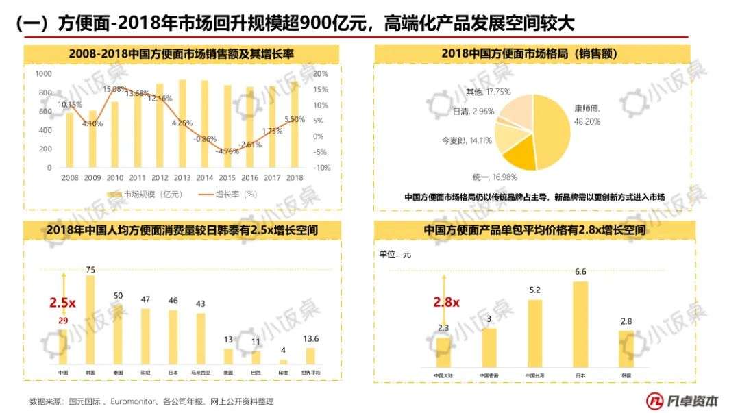 中国方便面市场的头部玩家有康师傅、统一、今麦郎与日清,虽然这些品牌一直在推陈出新,但也难以完全满足新消费需求 ,自2013年起市场销售额开始下降。销量方面,与韩国相比中国还有2.5倍的增长空间;产品单包平均价格上,与日本相比中国还有2.8倍的增长空间。
