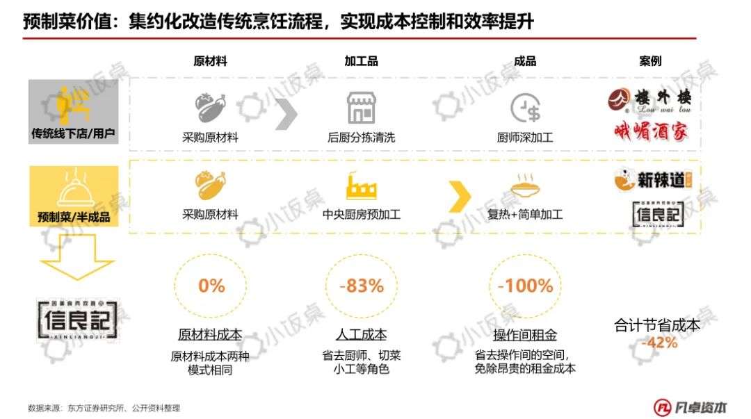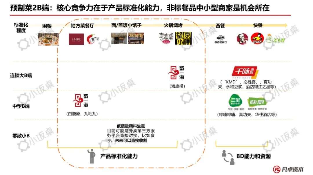上市公司产品以团餐半成品食材为主,多覆盖快餐、酒店、便利店等渠道,并且以资源优势多布局大连锁品牌;而新兴品牌的机会点主要集中在中小餐饮渠道。最终品牌的核心竞争力是产品标准化能力。