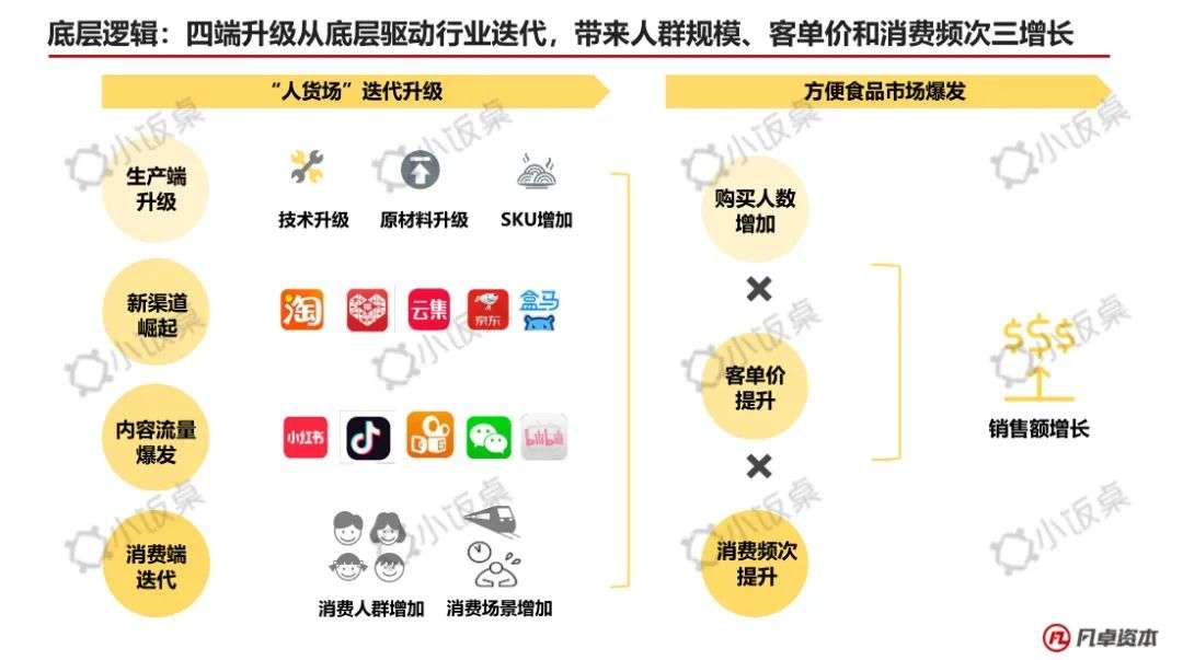 疫情只是在充当导火索的作用,方便食品整个赛道崛起的底层原因是生产端升级、新渠道崛起、内容流量爆发与消费端迭代的共同作用。