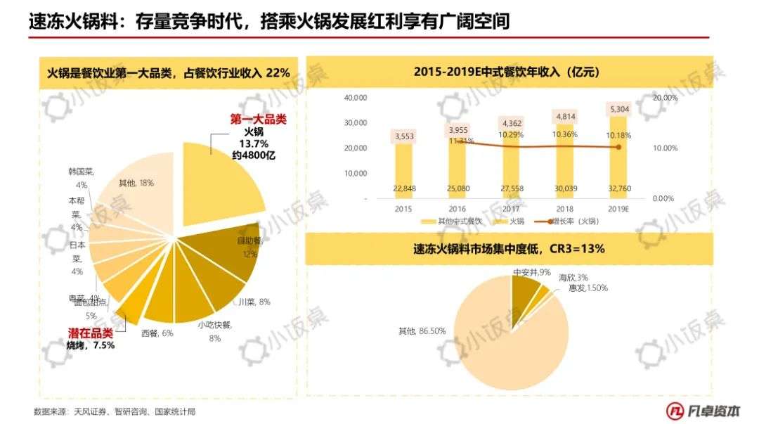 除了预制菜这个蓝海市场,速冻火锅料搭乘火锅发展红利也有广阔成长空间。