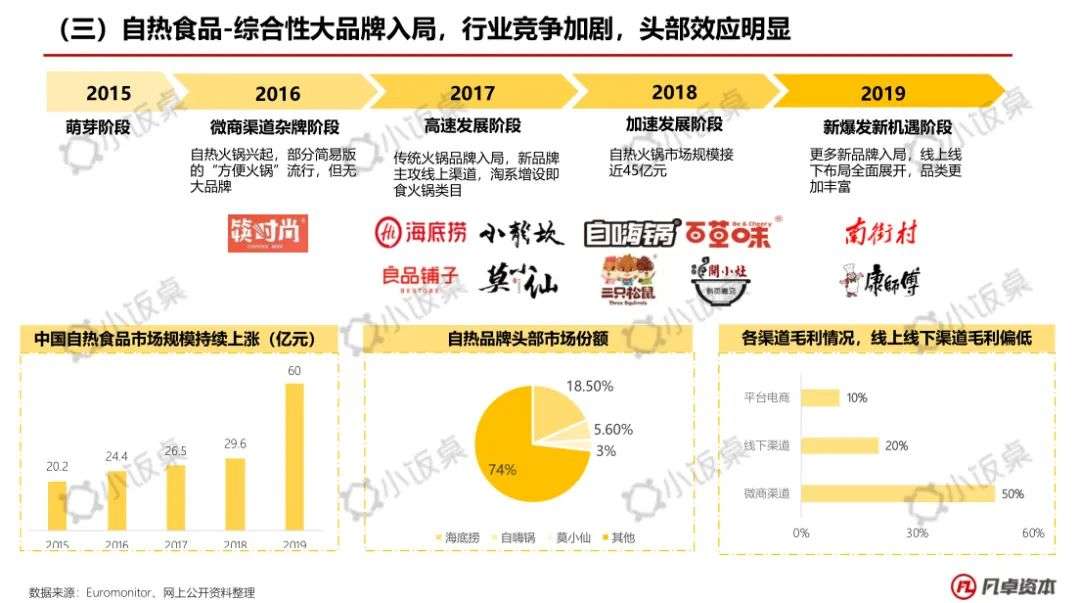自热食品最初兴起于微商渠道,当时部分简易版的“方便火锅”流行,但没有大品牌,2017年传统火锅品牌入局,也有一批主攻线上的新品牌创立,淘系增设即食火锅类目,2019年随着更多新品牌入局,线上线下布局全面展开,产品品类也更加丰富,市场规模已达60亿人民币。