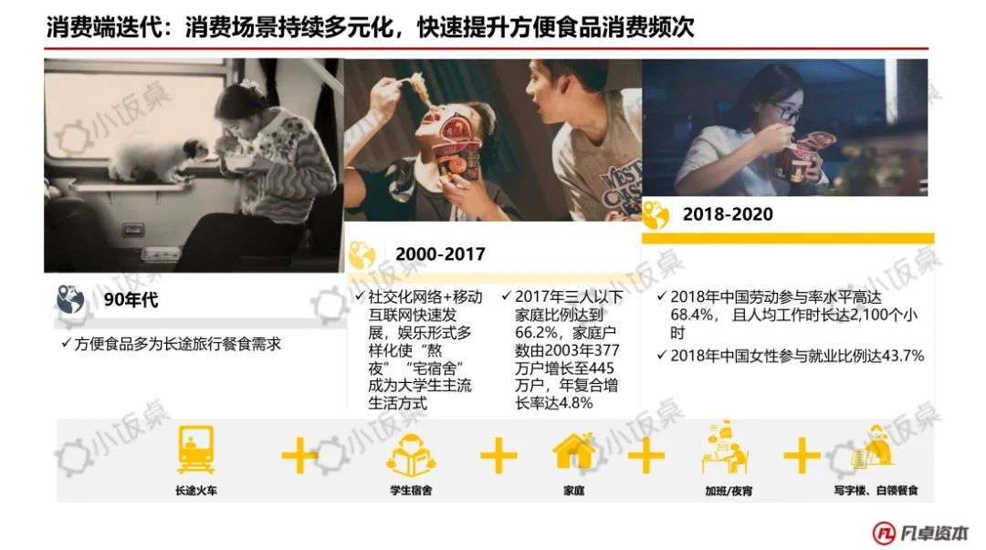 在消费端,伴随人群结构的变化,年轻人群正在成为消费主力,同时消费场景多元化发展使得方便食品的消费频次快速提升。上世纪90年代,方便食品多为解决长途旅行餐食需求,从2000年至今,方便食品的消费场景不断延伸至“熬夜”、“宅家”、“加班”的食物补充。