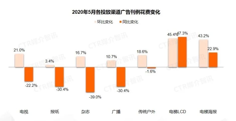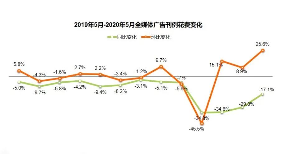 CTR媒介智讯日前发布《2020年5月广告投放数据》报告。数据显示,2020年5月,国内广告投放刊例花费环比继续提升,达到25.6%,同比降幅则进一步收窄为17.1%。