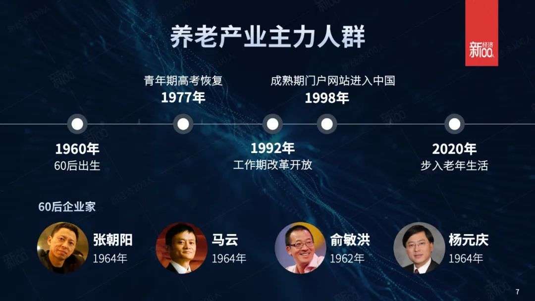 很多我们所熟知的企业家都出生于60年代,例如张朝阳生于1964年,马云生于1964年,俞敏洪生于1962年,杨元庆生于1964年,潘石屹生于1963年。这些看似「偶然」的出生年份背后恰好代表着60后这个群体的「必然性」。
