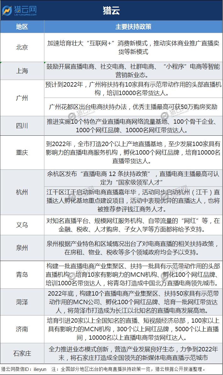 各地区陆续出台了专门的直播电商扶持政策,通过奖励现金、买房打折还能成领军人才等系列政策,各地区向头部主播及MCN机构抛来橄榄枝。此外,杭州、北京等地也陆续启动直播电商基地建设。