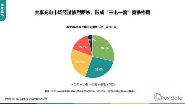 根据Trustdata发布的《2019年中国共享充电行业发展分析简报》,2019年共享充电行业总体已实现稳步增长,全年用户规模达到1.5亿人次。街电、小电、怪兽充电、来电4家头部企业的市场份额占比分别为28.6%、27%、25.1%和15.6%。