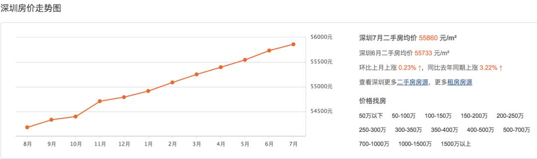 深圳7月二手房均价 55860 元/m²,同比去年同期上涨 3.22%。看下面的价格曲线,从2019年9月至2020年7月,深圳二手房明显在稳步上涨。