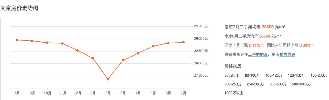 南京7月二手房均价 28855 元/m²,同比去年同期上涨 0.09%。从图中可以看出,南京二手房价因为疫情短期有所下降。随着疫情好转,当地二手房房价从今年3月开始一直在稳步上涨。